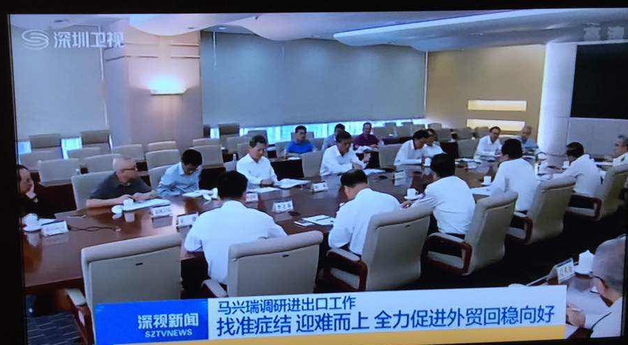 在深圳海关,马兴瑞主持召开座谈会,听取深圳海关关于我市进出口情况的介绍以及杨新洪关于我市跨境电商、融资租赁等新增长点的贡献情况汇报。马兴瑞肯定了深圳海关为稳定外贸形势作出的积极贡献,希望深圳海关继续创新服务,不断提高通关效率,市委、市政府将切实做好服务保障工作,共同推动外贸回稳向好。